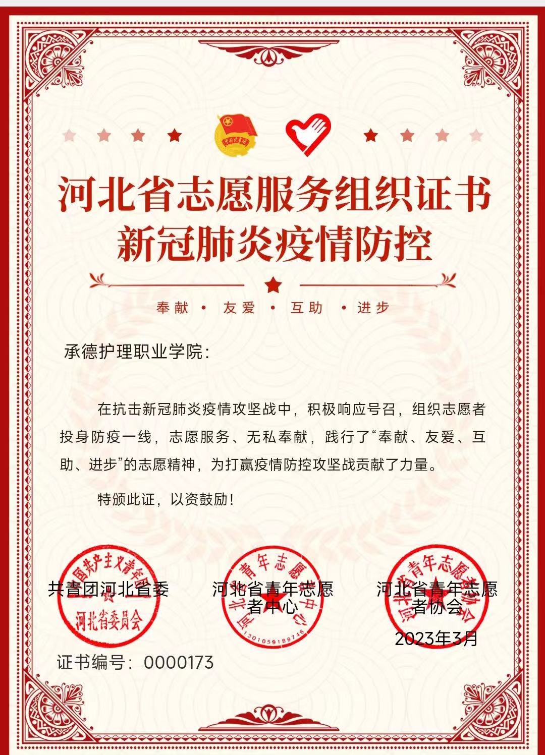 近日,共青团河北省委、河北省青年志愿者中心、河北省青年志愿者协会公布了高校申领“河北省志愿服务组织服务证书”的结果,我校荣获河北省志愿服务组织服务证书。