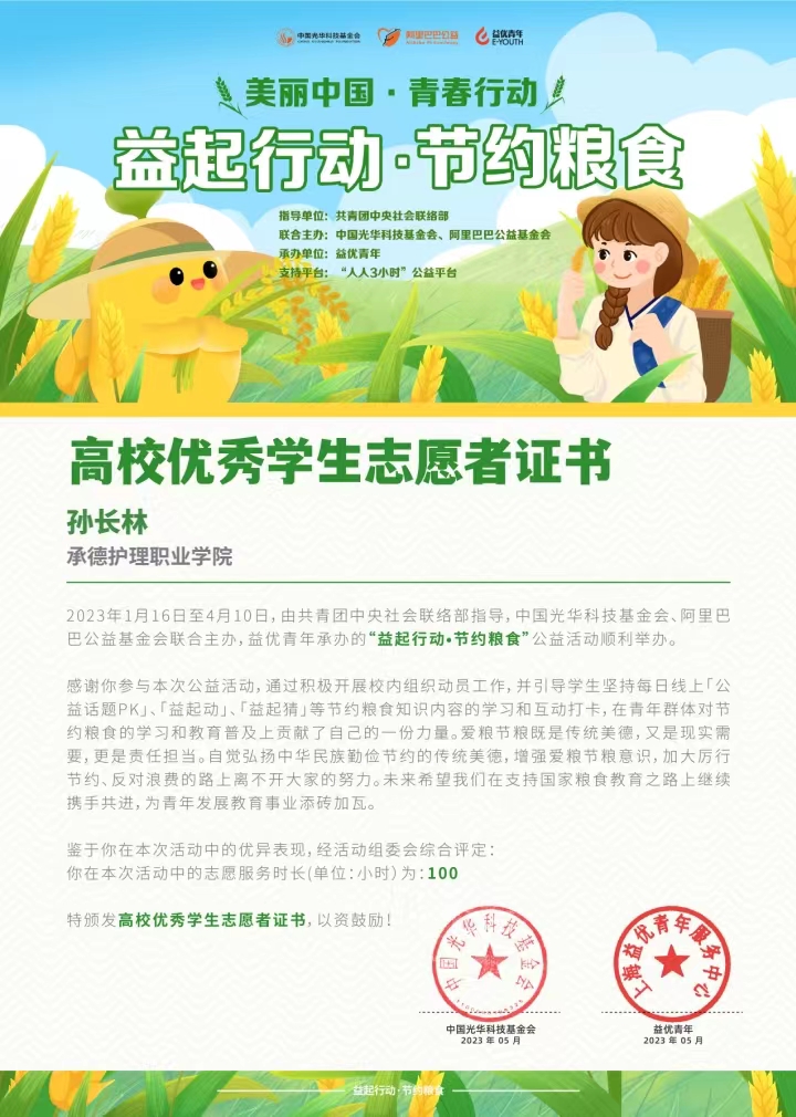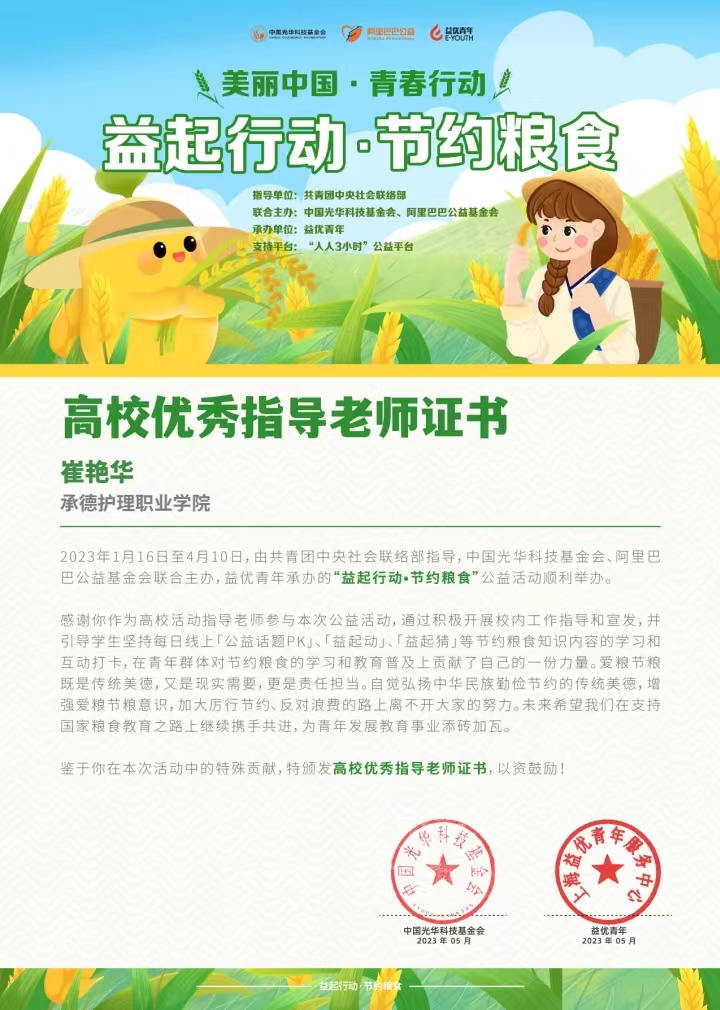 为宣传贯彻落实党的二十大精神和习近平总书记关于制止餐饮浪费的重要指示批示精神,弘扬节约粮食的精神,培育崇尚节约的校园文化。我校团委组织参加了由共青团中央社会联络部联合中国光华科技基金会和阿里巴巴公益基金会发起“益起行动·节约粮食”公益活动,并荣获优秀组织高校奖。