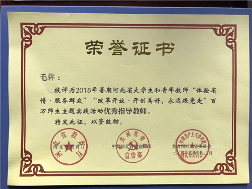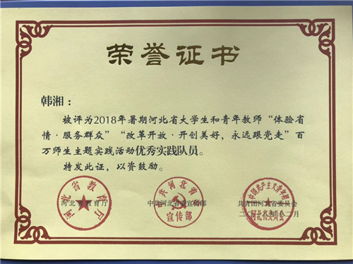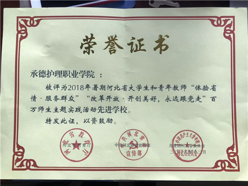 我院在河北省大学生和青年教师“体验省情•服务群众”“改革开放•开创美好,永远跟党走”“百万师生主题实践活动中荣获先进学校奖,同时医学系省级社会实践小分队获得 “先进小分队”称号;2名教师老师被评为“优秀指导教师”;刘妍、韩湘、林宇晨、闫照钦4名同学被评为“优秀实践队员”。