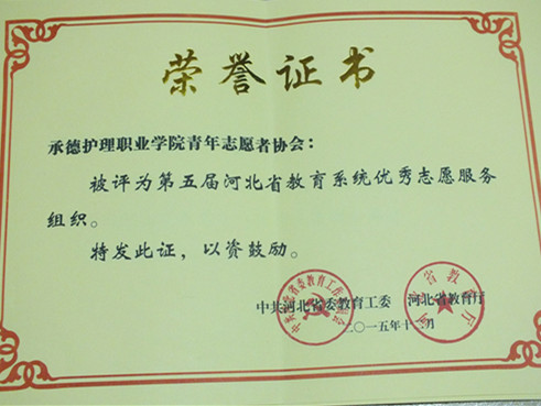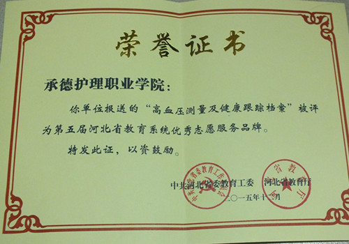 我院青年志愿者协会在中共河北省教育工委、河北省教育厅组织的第五届河北省教育系统优秀志愿服务活动评比中荣获“第五届河北省教育系统优秀志愿服务组织;报送的“高血压测量及健康跟踪档案”被评为“第五届河北省教育系统优秀志愿服务品牌”。