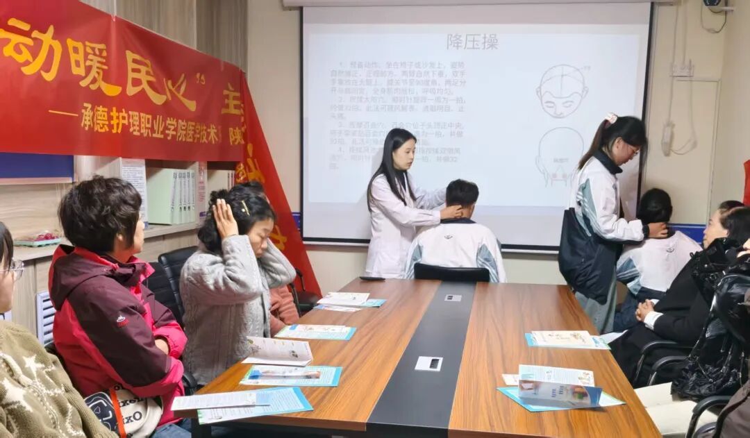 为弘扬中医药文化,提升居民慢性病自我管理能力,推广科学健康生活方式,2025年10月29日下午,学院中医药文化社团组织志愿者走进双桥区陕西营社区新时代文明实践中心,开展“慢病管理与降压操”主题科普宣传活动。